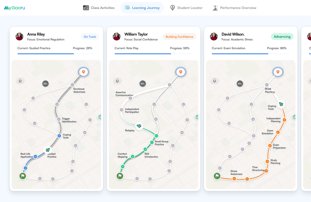 MAP builds beliefs about each student across emotional knowledge, mindset dispositions, personal interests, coping abilities, and support systems. For the socially anxious 6th-grader, MAP senses avoidance patterns and low self-efficacy through journaling responses and interaction data. It generates a pathway that starts with safe, private reflection exercises, builds toward guided social scenarios, and coordinates with the student’s teacher to create low-pressure classroom participation moments. For the 8th-grader navigating family stress, MAP recognizes strong social skills but declining academic engagement, and routes toward stress management and help-seeking strategies—with a nudge to the school counselor when warning signs emerge. Every student’s journey is different because every student’s emotional landscape is different.