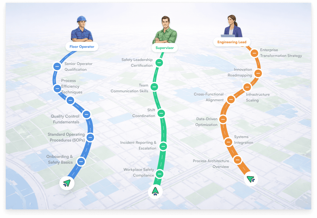 MAP models each employee across job-specific competencies, learning confidence, career interests, current skill levels, and team dynamics. For the floor operator, MAP senses through on-the-job assessments that she has strong manual process knowledge but low confidence with digital tools. It generates a pathway that starts with quick, practical micro-lessons tied to her specific production line, builds digital confidence through guided practice on actual equipment interfaces, and coordinates with her supervisor to reinforce new skills during shift. For the software architect, MAP recognizes deep technical fluency and high autonomy, and generates an advanced pathway of hands-on AI implementation projects with peer collaboration. The enterprise sees which teams are building real capability—not just completing courses—and can measure the productivity improvement directly.