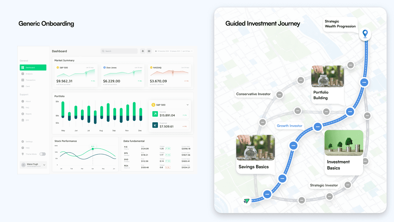 An online brokerage platform has millions of users and a rich education library covering everything from market basics to advanced derivatives. But every new user who opens an account sees the same homepage, the same content library, the same onboarding flow. A 22-year-old first-time investor with ₹10,000 to put away monthly sees the same experience as a 45-year-old trader managing a multi-crore portfolio. The platform acquires users at scale through low-fee positioning—but most new users never make it past their first few sessions. They browse education content, get overwhelmed by choice, and quietly disengage.