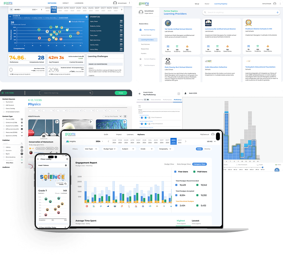 MyGooru Apps give every stakeholder in your learning institution the tools they need — personalized pathways for learners, real-time intervention guidance for instructors and coaches, leadership dashboards for program directors, mentor access for parents and advisors, and a curated content library aligned to your curriculum and goals.