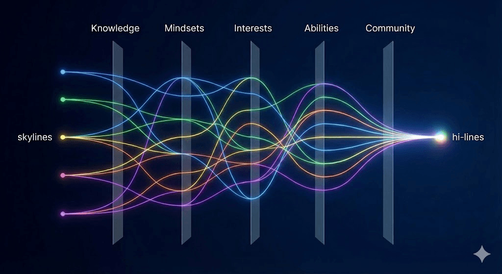 MAP models humans comprehensively across five interacting facets: Knowledge (what they know), Mindsets (how they think), Interests (what engages them), Abilities (their natural strengths), and Community (who supports them). This complete representation enables MAP to understand how small changes in one dimension trigger breakthroughs when other factors align.